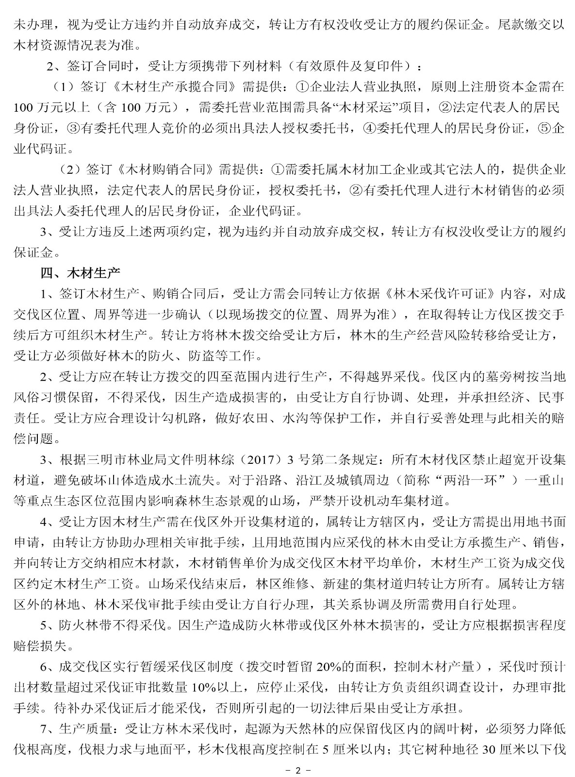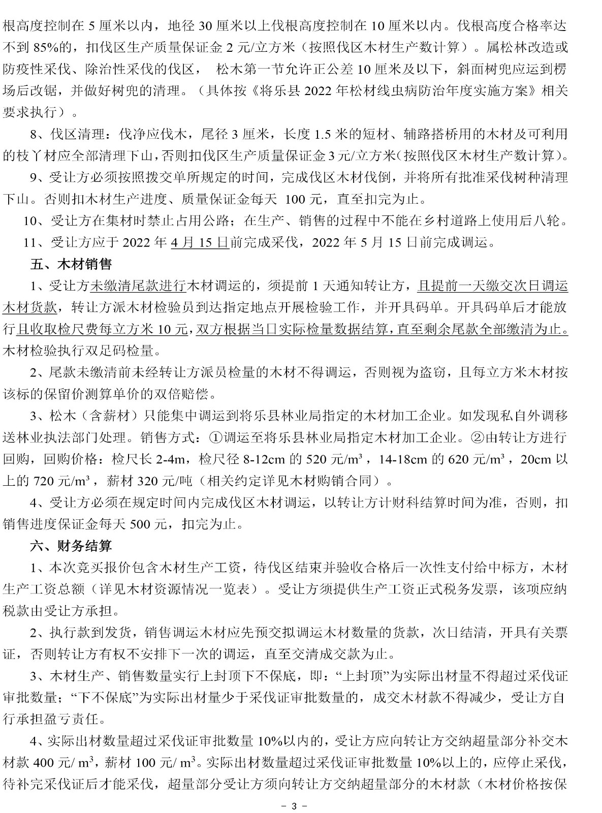 重要信息披露 | 1、標的簡介所列的出材量等數(shù)據(jù)僅供參考,標的以現(xiàn)狀交付,轉(zhuǎn)讓方及交易中心不承擔標的面積與實測面積、標的出材量與實際出材量差異等責任,不調(diào)整相應的成交價格。 2、本次競買報價包含木材生產(chǎn)工資,木材生產(chǎn)工資總額詳見木材資源情況一覽表,待伐區(qū)結(jié)束并驗收后一次性支付給受讓方。 3、銷售費用、成交后發(fā)生的政策變化費用、稅收均由受讓方承擔。 4、松木(含薪材)只能集中調(diào)運到將樂縣林業(yè)局指定的木材加工企業(yè)。如發(fā)現(xiàn)私自外調(diào)的,將移送林業(yè)執(zhí)法部門處理。銷售方式:①調(diào)運至將樂縣林業(yè)局指定木材加工企業(yè)。②由轉(zhuǎn)讓方進行回購(相關約定詳見木材購銷合同)。 5、受讓方應于2022年4月15日前完成采伐,2022年5月15日前完成調(diào)運。 6、未盡事宜詳見木材資源情況一覽表、競買約定、木材生產(chǎn)承包合同(范本)、木材購銷合同(范本)、伐區(qū)位置示意圖等本公告其他附件。 | ||