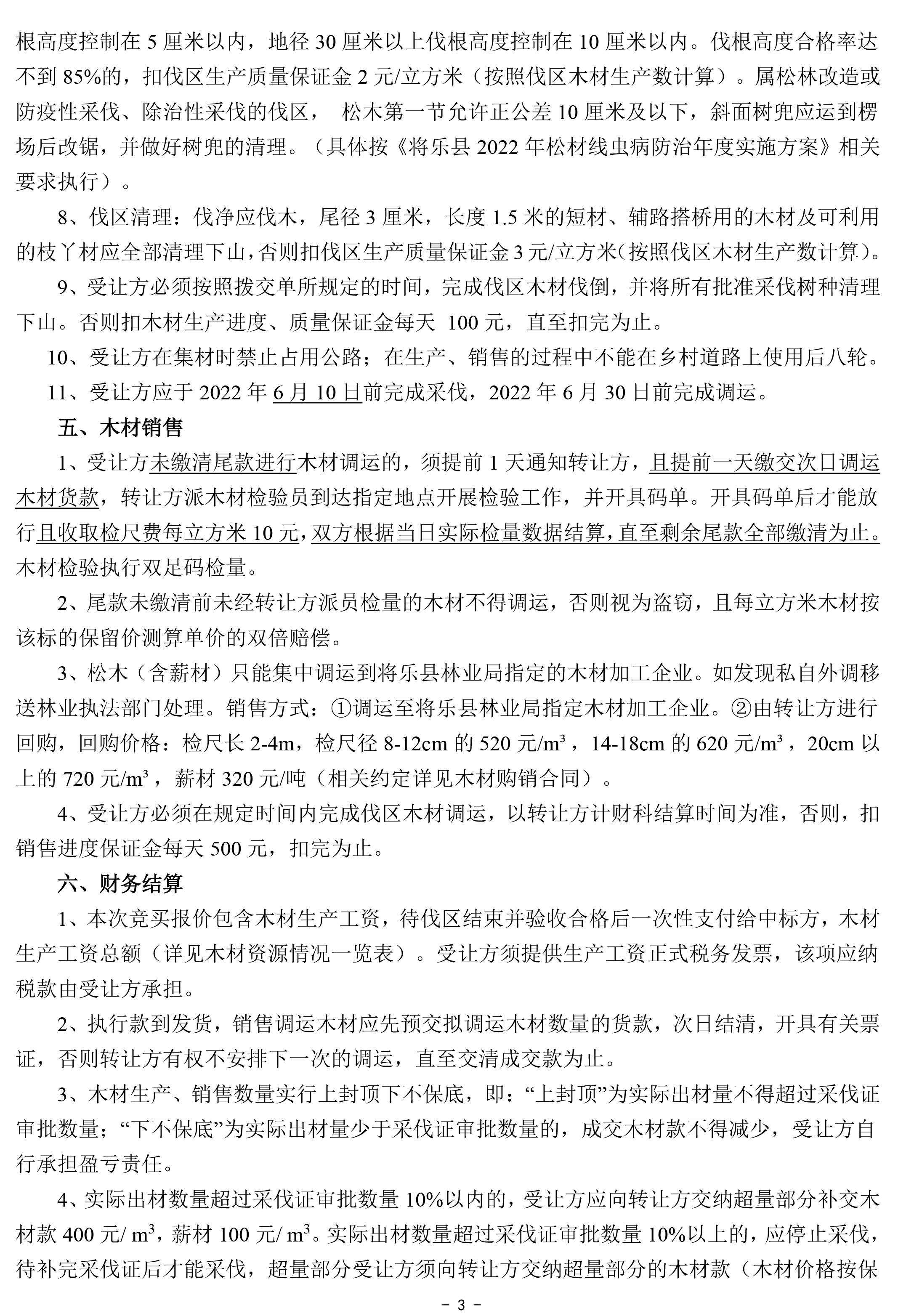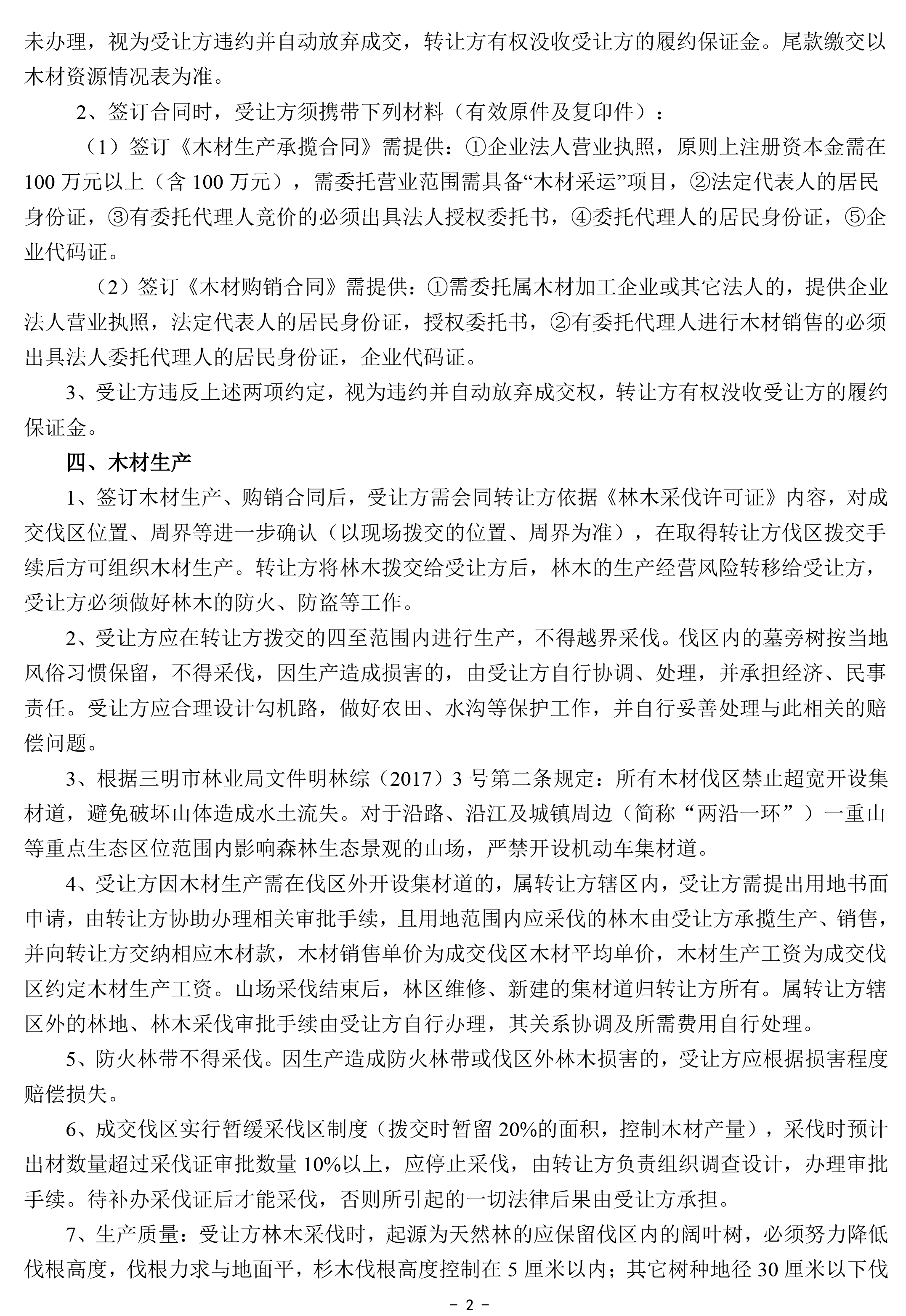 重要信息披露 | 1、標(biāo)的簡(jiǎn)介所列的出材量等數(shù)據(jù)僅供參考,標(biāo)的以現(xiàn)狀交付,轉(zhuǎn)讓方及交易中心不承擔(dān)標(biāo)的面積與實(shí)測(cè)面積、標(biāo)的出材量與實(shí)際出材量差異等責(zé)任,不調(diào)整相應(yīng)的成交價(jià)格。 2、本次競(jìng)買報(bào)價(jià)包含木材生產(chǎn)工資,木材生產(chǎn)工資總額詳見木材資源情況一覽表,待伐區(qū)結(jié)束并驗(yàn)收后一次性支付給受讓方。 3、銷售費(fèi)用、成交后發(fā)生的政策變化費(fèi)用、稅收均由受讓方承擔(dān)。 4、松木(含薪材)只能集中調(diào)運(yùn)到將樂(lè)縣林業(yè)局指定的木材加工企業(yè)。如發(fā)現(xiàn)私自外調(diào)的,將移送林業(yè)執(zhí)法部門處理。銷售方式:①調(diào)運(yùn)至將樂(lè)縣林業(yè)局指定木材加工企業(yè)。②由轉(zhuǎn)讓方指定單位進(jìn)行收購(gòu)(相關(guān)約定詳見木材購(gòu)銷合同)。 5、受讓方應(yīng)于2022年6月10日前完成采伐,2022年6月30日前完成調(diào)運(yùn)。 6、未盡事宜詳見木材資源情況一覽表、競(jìng)買約定、木材生產(chǎn)承包合同(范本)、木材購(gòu)銷合同(范本)、伐區(qū)位置示意圖等本公告其他附件。 | ||