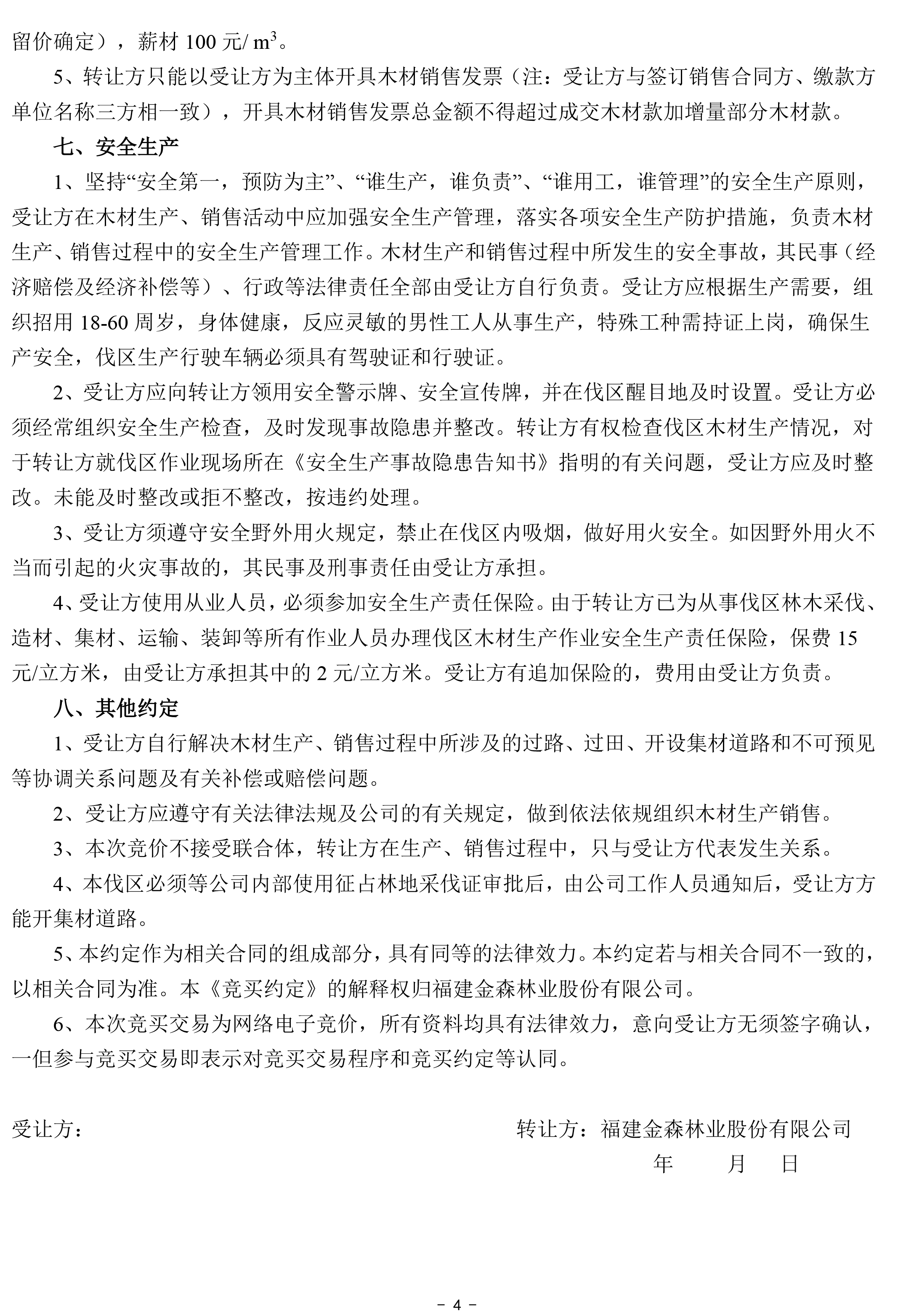 成交確認(rèn)、價(jià)款支付及合同簽訂 | 1 .成交后的兩個(gè)工作日內(nèi)受讓方以微信、郵箱等方式收到《成交通知書》掃描件或電話通知;若受讓方未及時(shí)收到成交通知書的,請(qǐng)主動(dòng)與轉(zhuǎn)讓方聯(lián)系。 2.價(jià)款交納日期及方式:成交后,受讓方須于2022年4月5日17:00前將首期木材款(詳見木材資源情況一覽表)及每標(biāo)生產(chǎn)風(fēng)險(xiǎn)保證金6.5萬(wàn)元(含木材生產(chǎn)進(jìn)度、質(zhì)量保證金3萬(wàn)元;銷售進(jìn)度保證金1.5萬(wàn)元;安全生產(chǎn)保證金2萬(wàn)元)轉(zhuǎn)入轉(zhuǎn)讓方指定銀行賬戶,并與轉(zhuǎn)讓方簽訂《木材生產(chǎn)承攬合同》和《木材購(gòu)銷合同》。尾款交付方式以木材資源情況一覽表為準(zhǔn)。 轉(zhuǎn)讓方指定銀行賬戶如下: 戶名:福建金森林業(yè)股份有限公司 開戶銀行:福建將樂(lè)成功村鎮(zhèn)銀行股份有限公司 賬號(hào):9031510010010000033058 3.受讓方不依據(jù)本公告的要求履約的,視為自動(dòng)放棄受讓資格,其已交納的交易保證金不予退回,并對(duì)交易中心因此造成的損失承擔(dān)賠償責(zé)任,轉(zhuǎn)讓方有權(quán)將該標(biāo)的重新組織競(jìng)買交易。 | ||